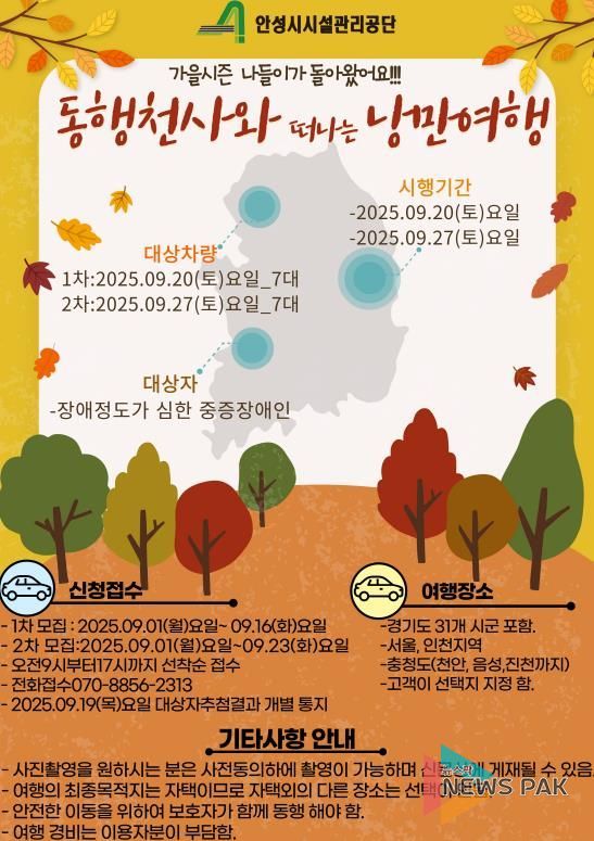 뉴스팍 배상미 기자 | 안성시시설관리공단 교통약자지원팀 ‘동행천사’는 오는 9월 20일 토요일과 9월 27일 토요일 이틀간 가을 여행시즌을 맞아 차량지원(유료) 서비스 ‘동행천사와 떠나는 낭만여행’을 실시한다고 밝혔다.