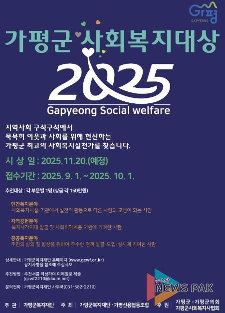 뉴스팍 배상미 기자 | 가평군은 가평군복지재단과 가평신용협동조합이 공동 주최하는 ‘2025년 가평군사회복지대상’ 후보자를 오는 10월 1일까지 접수한다고 밝혔다.