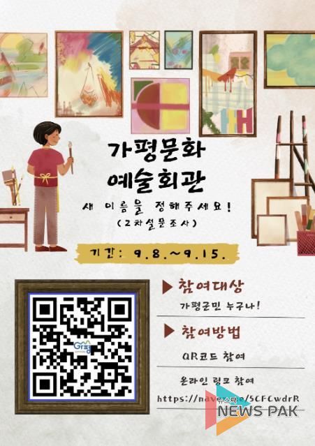 뉴스팍 배상미 기자 | 가평군이 리모델링 준공을 앞둔 가평문화예술회관의 새로운 명칭을 군민 의견으로 확정하기 위한 2차 설문조사에 들어갔다.