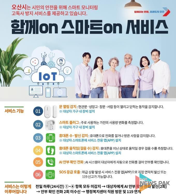 뉴스팍 이소율 기자 | 오산시는 9월부터 관내 고독사 위험 시민들의 사회적 고립을 해소하고 고독사 예방을 위해 사물인터넷(IoT) 기반 디지털 모니터링 서비스인 ‘함께on 스마트on 서비스’를 운영한다고 밝혔다.