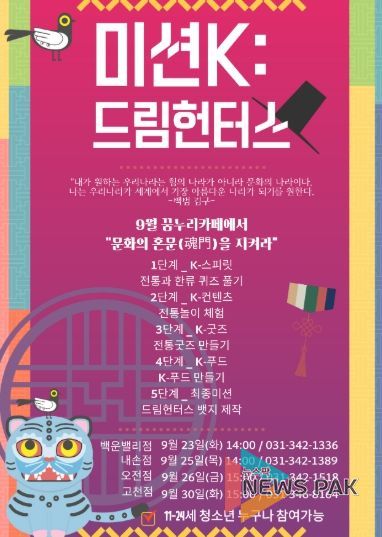 뉴스팍 배상미 기자 | 의왕시청소년재단 산하 의왕시청소년수련관 꿈누리카페가 오는 9월 넷째주 청소년들을 대상으로 진행하는 K-컬처 체험형 프로그램 '미션K: 드림헌터스'의 참가자를 모집한다.