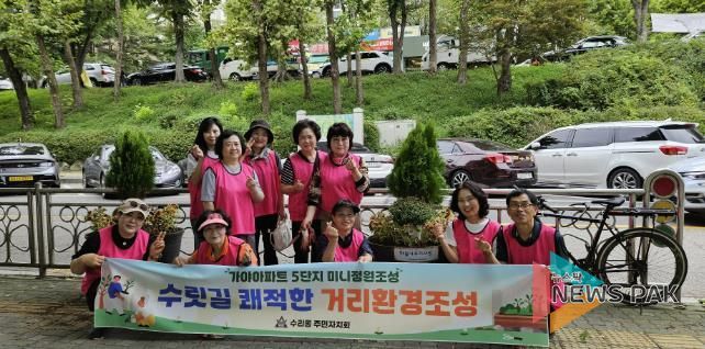 뉴스팍 배상미 기자 | 수리동 주민자치회는 지난 12일 수리산역 인근에서 화분 식재 사업을 실시했다. 이번 사업은 주민참여예산 사업 ‘수릿길 쾌적한 거리환경 조성’ 사업의 일환으로 수리산역과 가야 5단지 주변의 지역 환경을 개선하고 걷고 싶은 거리를 만들기 위해 마련됐다.