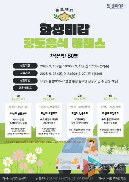 뉴스팍 류은정 기자 | 화성특례시는 지역의 맛과 멋이 살아있는 향토음식을 널리 알리기 위해 ‘화.성.미.감(華.城.味.感) 화성의 맛을 느끼다’를 주제로 향토음식 교육·전시를 개최한다고 15일 밝혔다.
