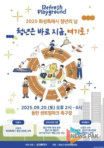 뉴스팍 류은정 기자 | 화성특례시는 오는 20일 오후 2시부터 6시까지 동탄 센트럴파크 축구장에서 ‘2025년 청년의 날 기념행사’를 개최한다고 밝혔다.