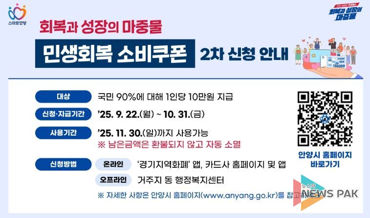 뉴스팍 배상미 기자 | 안양시가 오는 22일 지역 소비 촉진과 경제 활성화를 위한 민생회복 소비쿠폰 2차 지급을 시작한다고 17일 밝혔다.