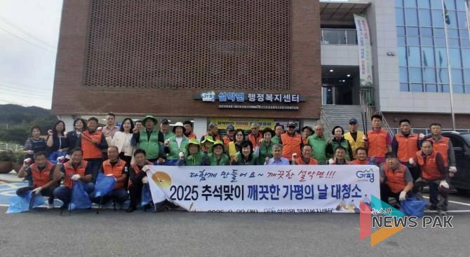 뉴스팍 배상미 기자 | 가평군 설악면은 지난 22일 ‘추석맞이 깨끗한 가평의 날’ 대청소 행사를 개최했다. 이번 행사는 '대한민국 새단장 캠페인'의 일환으로, 설악면과 지역사회가 함께 참여해 쾌적한 환경 조성을 목표로 진행됐다.