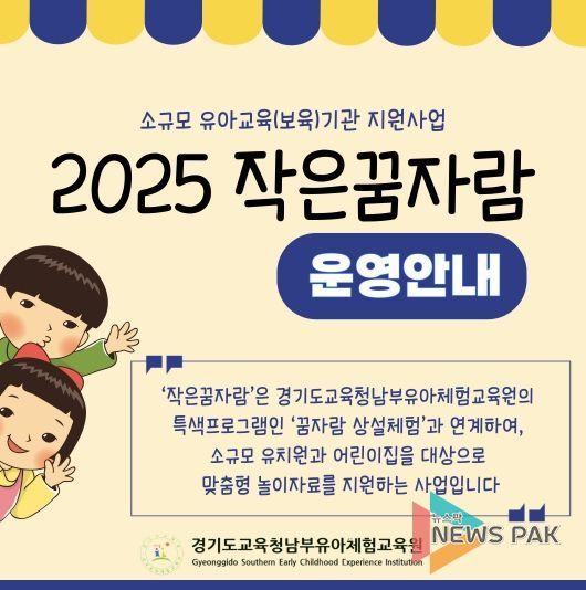뉴스팍 배상미 기자 | 경기도교육청남부유아체험교육원이 소규모 유치원과 어린이집을 대상으로 맞춤형 놀이자료 지원 프로그램 ‘2025 작은꿈자람’을 운영한다.