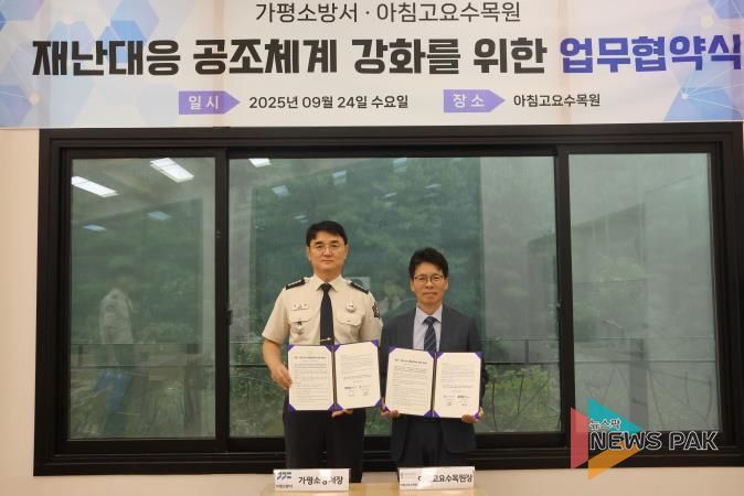 뉴스팍 배상미 기자 | 가평소방서는 지난 24일 아침고요수목원과 재난·재해 대응 역량 강화 및 지역사회 안전문화 정착을 위한 업무협약(MOU)을 체결했다고 밝혔다.