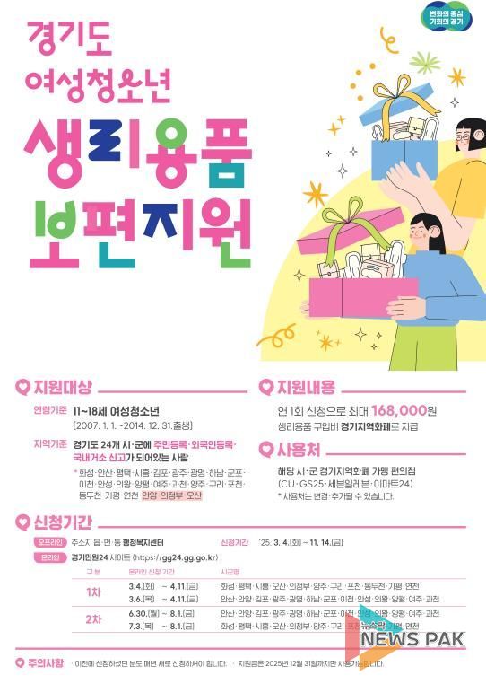 뉴스팍 류은정 기자 | 화성특례시가 11월 14일까지 ‘2025년 여성청소년 생리용품 보편지원 사업’ 신청을 주소지 읍면동 행정복지센터에서 현장 접수한다고 26일 밝혔다.
