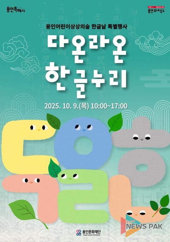 뉴스팍 배상미 기자 | 용인문화재단은 오는 10월 9일, 제579돌 한글날을 기념해 어린이를 위한 특별행사 ‘다온라온 한글누리’를 용인어린이상상의숲에서 개최한고 밝혔다.