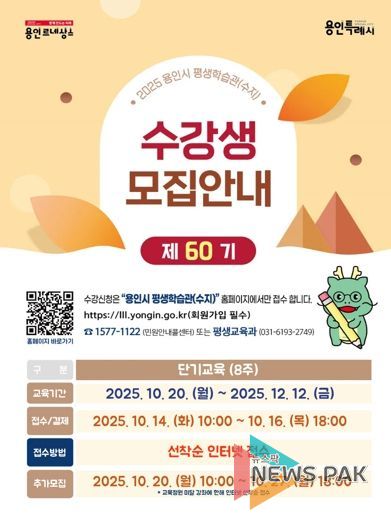 뉴스팍 배상미 기자 | 용인특례시는 14일부터 16일까지 수지에 위치한 용인시 평생학습관에서 진행되는 ‘제60기 단기(8주) 교육 프로그램’ 수강생을 모집한다고 9일 밝혔다.