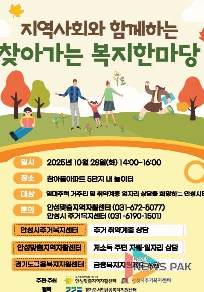뉴스팍 배상미 기자 | 안성시는 오는 10월 28일 오후 2시부터 4시까지 참아름아파트 5단지 내에서 ‘지역사회와 함께하는 찾아가는 복지 한마당’을 열고, 시민들을 대상으로 찾아가는 주거복지 이동상담소를 운영한다.