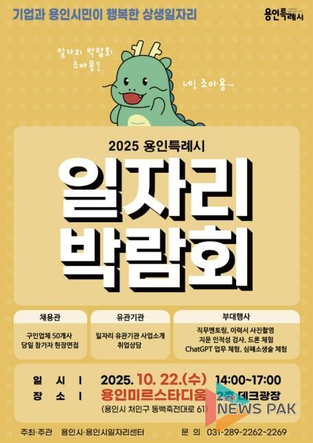뉴스팍 배상미 기자 | 용인특례시는 오는 22일 오후 2시부터 5시까지 용인미르스타디움 2층 덱(deck) 광장에서 2025년 하반기 일자리박람회를 개최한다고 17일 밝혔다.