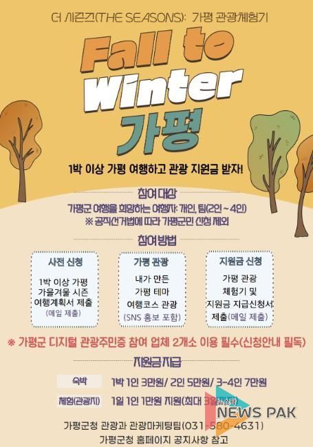 뉴스팍 배상미 기자 | 가평군은 가을과 겨울철 지역관광 활성화를 위해 체류형 관광객에게 숙박비와 체험비를 지원하는 ‘더 시즌즈(The Seasons) 행사를 추진한다고 17일 밝혔다.