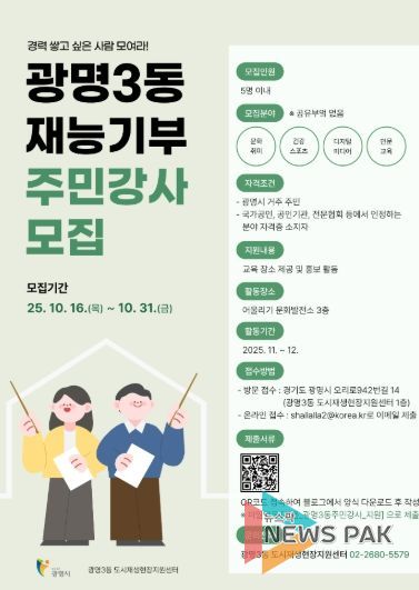 뉴스팍 배상미 기자 | 광명시는 주민 재능 나눔으로 지역 공동체 활력을 높이기 위해 광명3동 어울리기 문화발전소에서 교육 프로그램을 운영할 주민 강사를 모집한다고 17일 밝혔다.