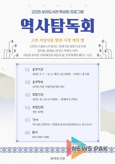뉴스팍 배상미 기자 | 용인특례시 보라도서관은 오는 11월 7일부터 12월 5일까지 고전 인문학 프로그램으로 ‘2025 역사 탐독회’를 운영한다고 21일 밝혔다.