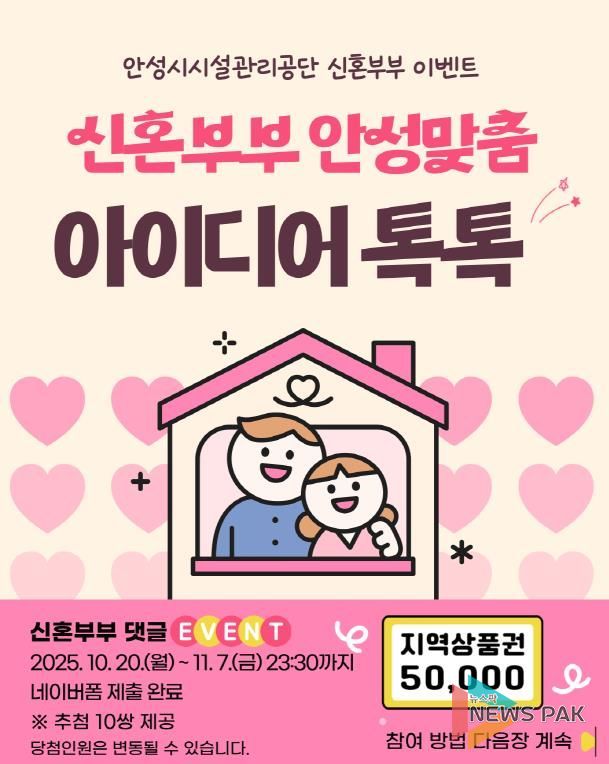 뉴스팍 배상미 기자 | 안성시시설관리공단은 안성시에 거주하는 신혼부부의 의견을 직접 듣고, 공단 시설과 서비스를 생활 속에서 체감할 수 있도록 발전시키기 위해 ‘신혼부부의 안성맞춤 아이디어 톡톡’ 공모전을 개최한다.