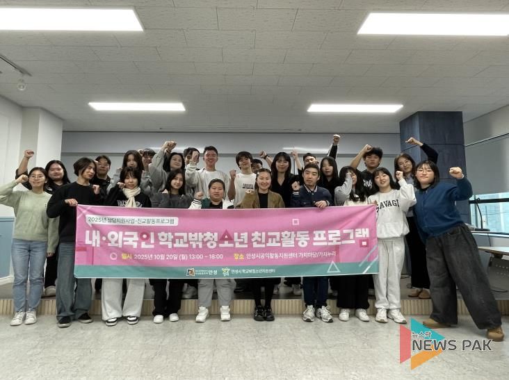 뉴스팍 배상미 기자 | 안성시학교밖청소년지원센터는 지난 10월 20일 안성공익활동지원센터 가치마당·가치누리에서 내·외국인 학교 밖 청소년이 함께 참여한 친교활동 프로그램을 성황리에 마무리했다.