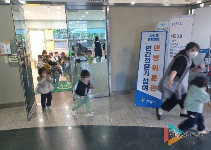 뉴스팍 배상미 기자 | 광명시 일직동 행정복지센터는 23일 영유아와 어린이집 교사를 대상으로 화재 대비 훈련을 실시했다.