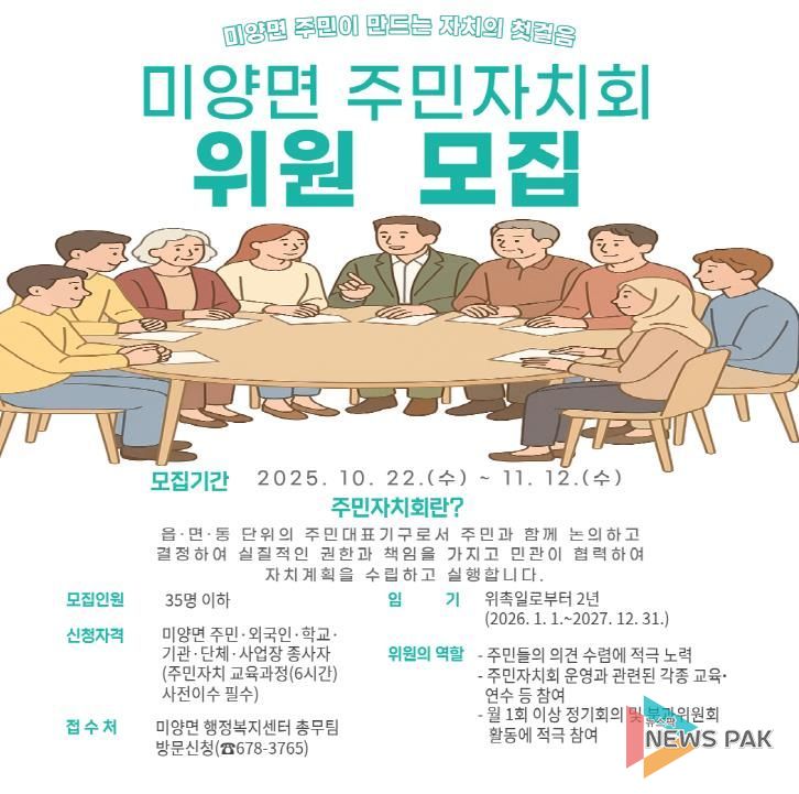 뉴스팍 배상미 기자 | 지난 10월 22일부터 미양면은 안성시 주민자치회 시범실시 및 설치·운영에 관한 조례'에 따라 지역의 자치계획을 수립하고 실행할 ‘미양면 주민자치회 위원’을 11월 12일까지 모집한다.