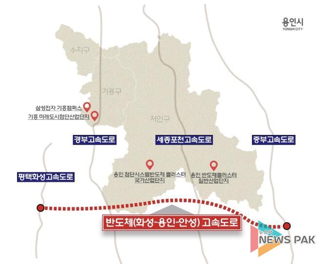 ‘반도체 고속도로’는 이동·남사읍의 첨단시스템반도체 국가산업단지와 원삼면의 용인반도체클러스터를 동서로 연결하는 핵심 산업축으로 경부고속도로, 국토45호선, 포천~세종 고속도로, 중부고속도로와 연결된다.