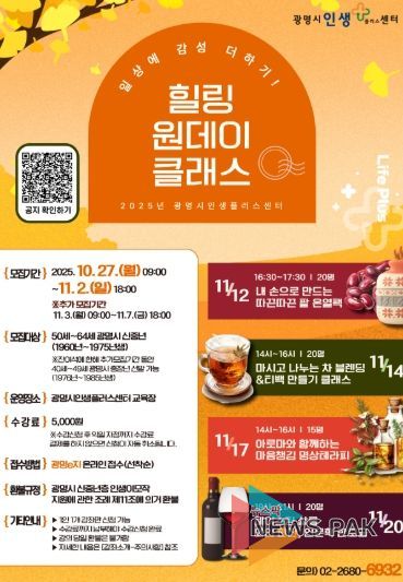 뉴스팍 배상미 기자 | 광명시 인생플러스센터가 오는 11월 12일부터 20일까지 신중년의 정서적 힐링과 문화 감수성 향상을 위한 ‘일상에 감성 더하기! : 힐링 원데이 클래스’를 운영한다.