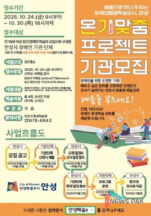 뉴스팍 배상미 기자 | 안성시는 장애인 평생학습도시로서 이동의 불편을 해소하고 학습권을 보장하기 위해, 오는 10월 30일까지 ‘찾아가는 장애인 평생학습 온기맞춤 프로젝트’에 참여할 장애인 기관·단체를 모집한다.