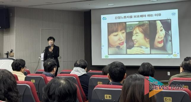 이날 교육에서는 대진대학교 감정노동산업재해예방센터 김황곤, 김지양 교수가 감정노동자 보호법과 모범지침을 비롯해 감정노동자의 특성과 심리 이해, 문제 상황별 대응 방안 등을 다뤘다.