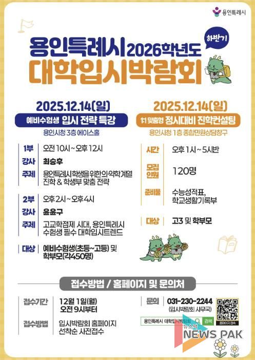 뉴스팍 배상미 기자 | 용인특례시는 12월 1일 오전 10시부터 오후 5시 30분까지 시청 에이스홀과 종합민원상담창구에서 ‘하반기 2026학년도 대학입시박람회’를 연다고 25일 밝혔다.