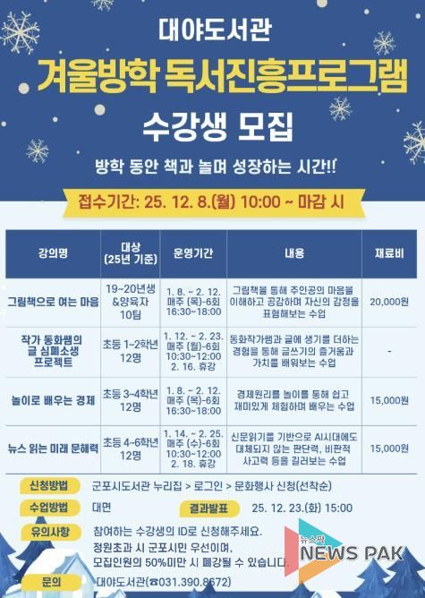 뉴스팍 배상미 기자 | 군포시 대야도서관은 겨울방학을 맞이하여 유아 및 초등학생을 위한 2026년 겨울방학 독서진흥프로그램을 오는 2026년 1월 8일부터 2월 25일까지 운영한다.
