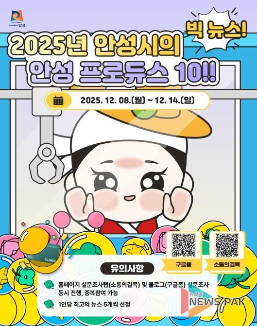 시 관계자는 “2025년 안성이 이뤄낸 의미 있는 변화들은 시민 여러분의 관심과 성원이 있었기에 가능했다”며 “한 해를 마무리하는 시점에 시민분들이 생각하는 ‘올해 안성의 대표 뉴스’ 선정에 많은 참여를 부탁드린다”고 밝혔다.