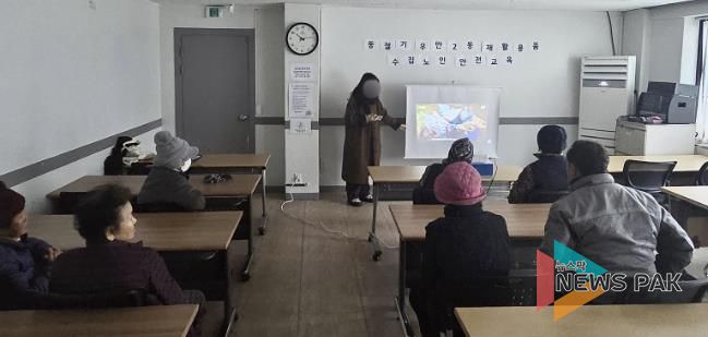 이번 교육은 재활용품 수집 과정에서 발생할 수 있는 교통사고 및 안전사고를 예방하고, 한파에 취약한 어르신들의 건강관리를 돕기 위해 마련됐으며, 안전 관련 동영상 시청을 통해 차도 통행에서 발생할 수 있는 사고 위험성을 안내하고, 재활용품 수집 시 유의 사항과 동절기 한파 대비 건강관리 요령을 중심으로 설명이 이루어졌다.
