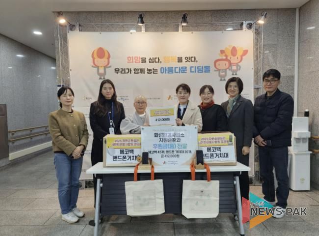 뉴스팍 류은정 기자 | 화성특례시가 지난 16일 화성시아르딤복지관에 2025년 자원순환실천 시민봉사활동으로 마련된 에코백·핸드폰거치대와 재활용나눔장터 활동으로 마련된 기부금 40만 원을 전달했다.