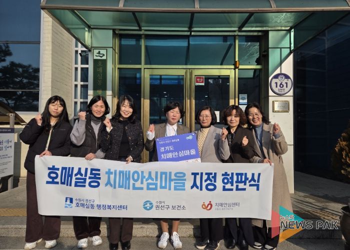 뉴스팍 배상미 기자 | 수원시 권선구보건소 치매안심센터가 호매실동을 ‘치매안심마을’로 지정했다. 권선구보건소는 17일 호매실동 행정복지센터에서 ‘호매실동 치매안심마을 지정 현판식’을 열었다.