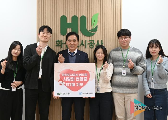뉴스팍 류은정 기자 | 화성도시공사는 연말을 맞아 임직원들의 자발적 참여로 모인 헌혈증 137매를 한국백혈병소아암협회에 기부하며, 생명 나눔을 통한 사회적 가치 실현에 나섰다고 밝혔다.