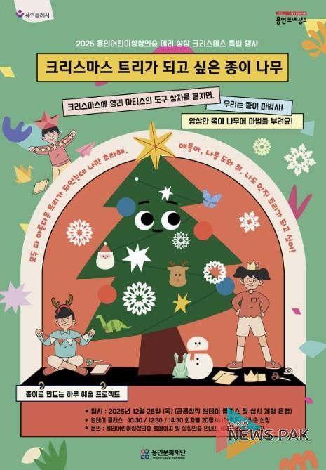 뉴스팍 배상미 기자 | 용인문화재단은 오는 12월 25일에 크리스마스를 맞아 용인어린이상상의숲과 용인문화도시플랫폼 공생광장 일원에서 다양한 문화예술 프로그램을 즐길 수 있는 크리스마스 특별행사를 개최한다.