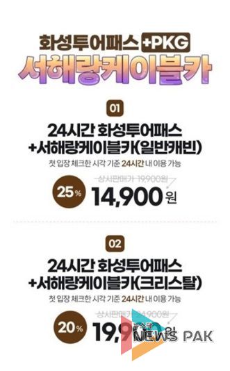 ‘화성투어패스 + 서해랑케이블카 PKG권’은 화성투어패스 이용권을 구매하면 서해랑케이블카 크리스탈 캐빈이나 일반 캐빈을 무료로 이용할 수 있는 상품으로, 이벤트 기간 동안은 기존 가격 대비 5천 원 할인해 판매한다.