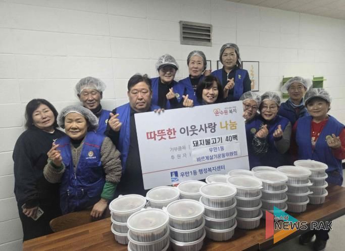 정연직 우만1동 바르게살기운동위원회 위원장은 “회원들이 정성껏 준비한 고기 반찬이 추운 날씨에 따뜻한 도움이 되길 바란다”며 “앞으로도 지속적인 봉사활동을 통해 지역사회 나눔 활동에 힘쓰겠다”고 말했다.