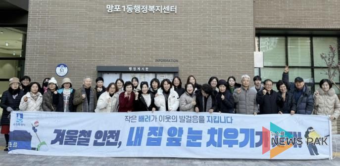 뉴스팍 배상미 기자 | 수원시 영통구 망포1동 행정복지센터는 지난 12월 19일 통장, 공무원 등 40여 명이 참여한‘내 집 앞 눈 쓸기 캠페인’을 실시했다.