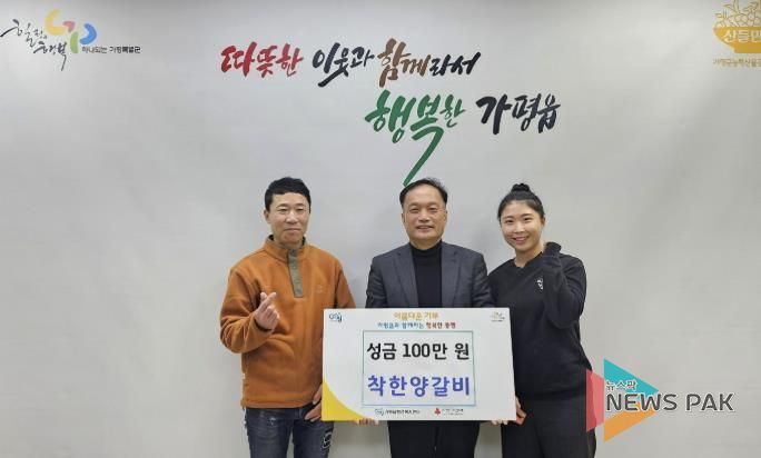 뉴스팍 배상미 기자 | 가평군 가평읍 경춘로 소재 착한양갈비는 지난 19일 행정복지센터를 방문해 이웃돕기 성금 100만 원을 기탁했다.