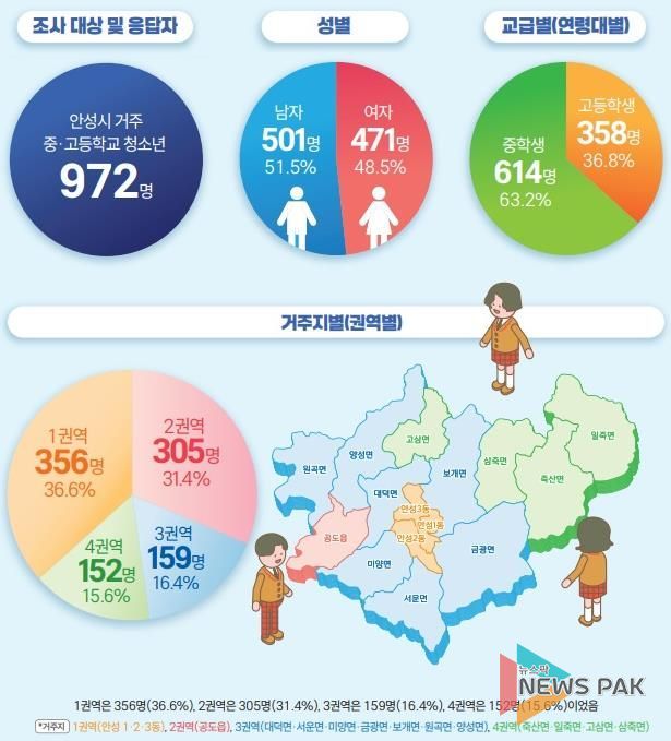 뉴스팍 배상미 기자 | 안성시청소년수련관은 지난 9월 안성시에 거주하는 중‧고등학생 청소년 972명을 대상으로'2025년 안성시 청소년 실태조사'설문조사를 실시하고, 그 결과를 발표했다. 이번 조사는 안성시 청소년의 생활 실태에 대한 객관적 자료를 축적해 체계적인 청소년 정책 수립의 기초자료로 활용하고, 청소년 요구에 부합하는 프로그램 개발을 통해 시설 이용률을 높이고자 추진됐다.