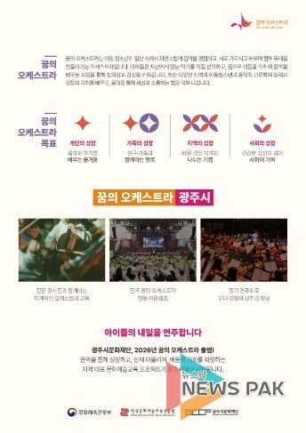 뉴스팍 이화형 기자 | (재)광주시문화재단은 문화체육관광부가 주최하고 한국문화예술교육진흥원이 주관하는 ‘2026 꿈의 오케스트라 운영사업’에서 예비 거점기관 단계를 거쳐 최종 신규 거점기관으로 선정됐다고 22일 밝혔다.