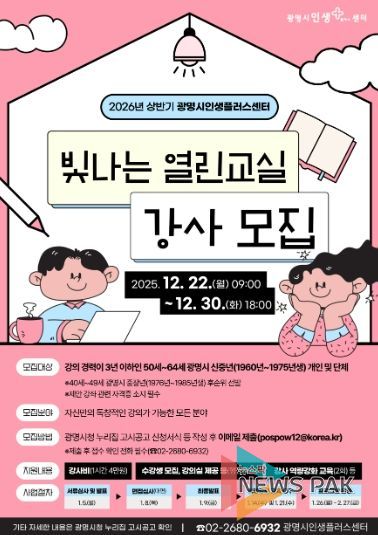 뉴스팍 배상미 기자 | 광명시는 오는 30일까지 ‘2026년 상반기 빛나는 열린교실’에 참여할 신중년 아마추어 강사를 모집한다.