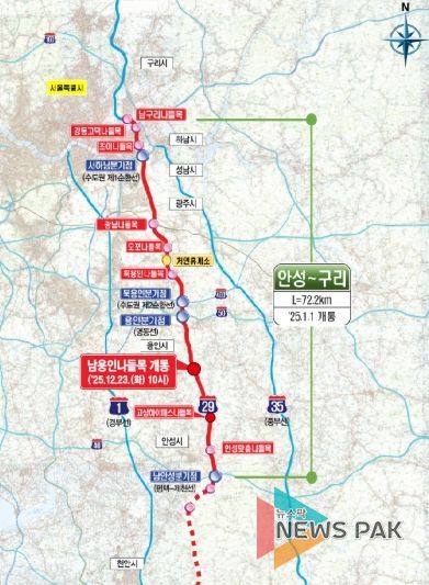 안성~용인~구리 구간(72.2㎞)은 1월 1일 개통됐다. 이 가운데 처인구 모현읍에서 원삼면까지 용인을 남북으로 관통하는 구간의 길이는 26㎞다. 포천~구리 구간(44.6㎞)은 지난 2017년 개통됐고, 안성~세종 구간(59.5㎞)은 2026년 말 개통 예정이다.