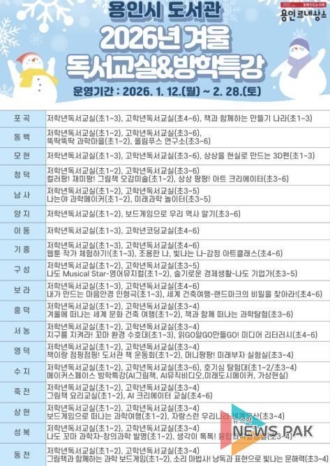 뉴스팍 배상미 기자 | 용인특례시는 내년 1월 12일부터 2월 28일까지 도서관에서 겨울 독서 교실과 방학 특강을 운영한다고 밝혔다.