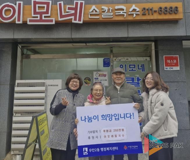 뉴스팍 배상미 기자 | 수원시 팔달구 우만2동은 지난 23일, 이모네칼국수와 함께 이웃나눔 후원금 전달식을 진행했다고 밝혔다.