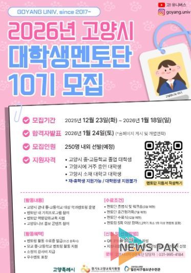 뉴스팍 배상미 기자 | 고양특례시가 지역 청소년들의 진로 설계를 도울 대학생 멘토단 ‘고양유니브’의 2026년도 신입 단원을 1월 18일까지 모집한다고 밝혔다.