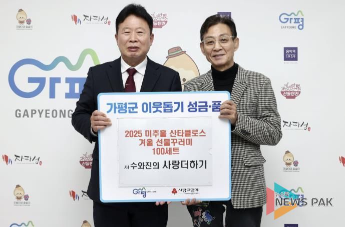 서태원 가평군수는 “매년 따뜻한 나눔을 실천하며 지역사회에 귀감이 되고 있는 사단법인 수와진의 사랑더하기에 깊이 감사드린다”며 “기탁해 주신 산타 꾸러미는 꼭 필요한 분들께 소중히 전달하겠다”고 밝혔다.