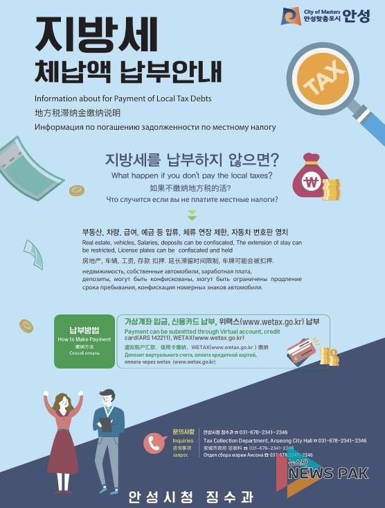 뉴스팍 배상미 기자 | 안성시는 외국인 근로자의 지방세 체납액 징수를 위해 외국인 전용보험 압류를 추진한다고 밝혔다.
