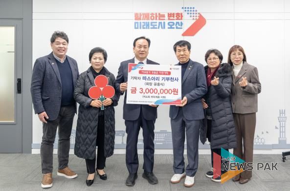 뉴스팍 이소율 기자 | 오산시는 지난 24일 따스아리 기부천사로부터 저소득 취약계층 지원을 위한 후원금 300만 원을 기탁받았다고 밝혔다.